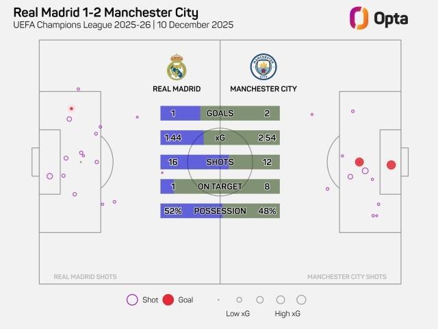 与曼城一役仅1次射正,为有统计以来皇马欧冠主场最低